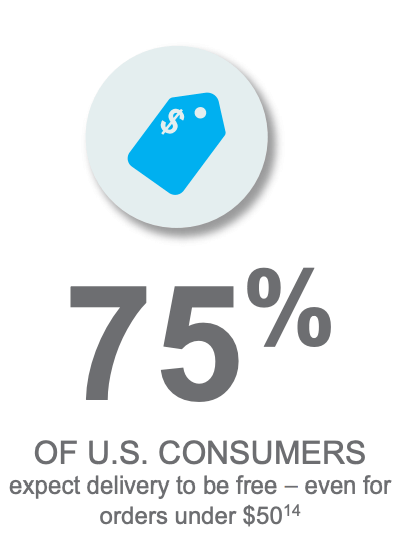 As we’ve seen, consumers now expect fast, same-1-2 day delivery or pick-up of their orders. But even if you are not convinced you need to offer accelerated shipping, note this: free shipping is no longer optional. Once upon a time, free shipping was a competitive point of difference. Those days are gone. Now 75% of consumers expect delivery to be free even on orders under $50. [14]